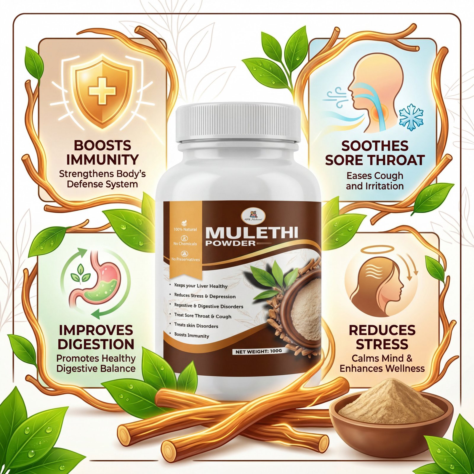 This versatile herbal powder can be easily added to warm water, herbal tea, or health drinks as part of your daily wellness routine. Rich in natural antioxidants, mulethi helps support the body’s natural defense system and contributes to a healthy lifestyle.