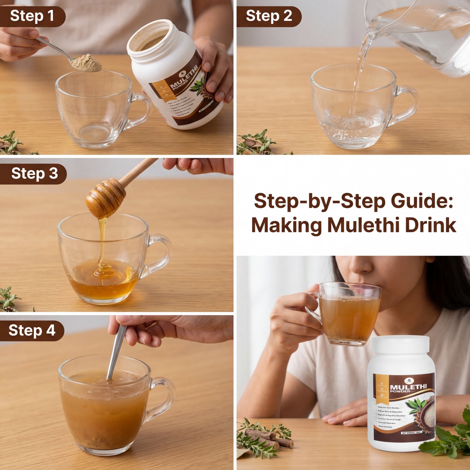 Add 1/2 teaspoon mulethi powder to a cup of warm water or herbal tea.
