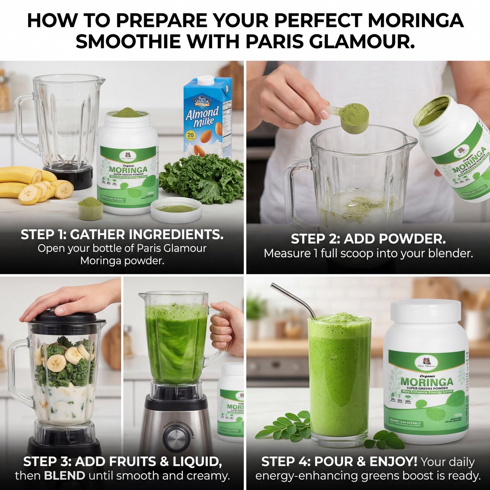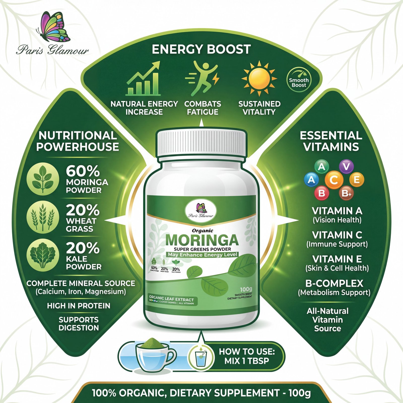Paris Glamour Moringa Powder is a premium quality 100% natural moringa leaf powder made from carefully selected drumstick leaves. Known as a powerful superfood, moringa is rich in essential vitamins, minerals, antioxidants, and plant protein that support overall health and wellness.