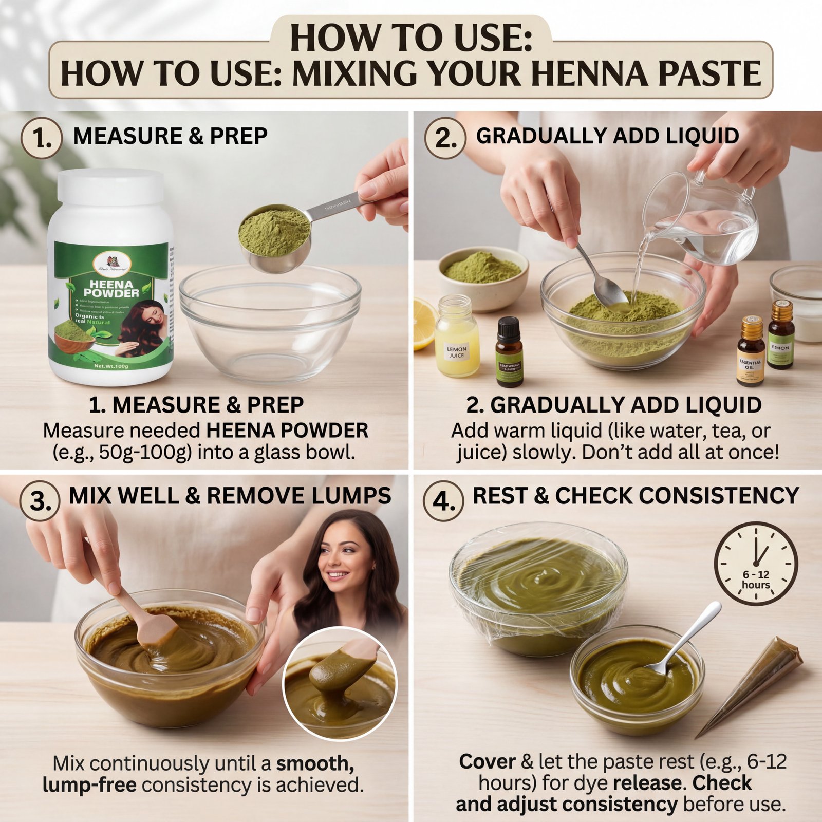 1. Mix: Take 100g Henna Powder or as needed. Add warm water + 1 tsp lemon juice + 1 tsp coffee to make a thick paste. Soak 6-8 hours or overnight.